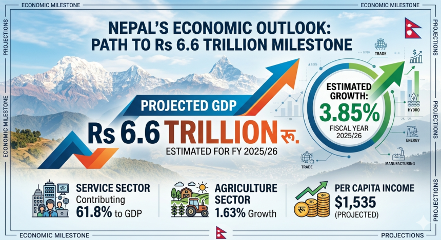 The Government of Nepal has projected that the size of the country’s economy will reach approximately NPR 6.6 trillion (in purchaser’s price term) in the current fiscal year 2025/26. For comparison, the revised estimate of the economy’s size in the previous fiscal year (2024/25) stands at NPR 6.199 trillion, while it was NPR 5.76 trillion in 2023/24.